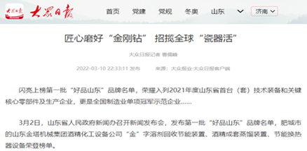 時代的華章,總是在奮斗中書寫。備受全市人民矚目的市十八屆人大五次會議和市政協九屆五次會議勝利召開。這次“兩會”進一步清晰目標任務,更凝成了思想共識,積聚了奮進前行的磅礴力量。 “十三五”期間,高新技術產業占比62.3%,比“十二五”末提高33.1個百分點。擁有國家制造業單項冠軍5家、綠色工廠4家、知識產權優勢企業5家,省制造業單項冠軍7家、瞪羚企業6家、隱形冠軍7家、專精特新中小企業65家,2020年獲評山東優質品牌19個,山東知名品牌24個,參與制修訂各類標準48項。其中山東金塔集團擁有: 國家高新技術企業(3家):肥城金塔酒精化工設備有限公司、肥城金塔機械科技有限公司、肥城金威機械有限公司。 國家制造業單項冠軍(2家):肥城金塔酒精化工設備有限公司、肥城金塔機械科技有限公司。 知識產權優勢企業(1家):山東金塔機械集團有限公司。 瞪羚企業(1家):肥城金塔機械科技有限公司。 隱形冠軍(1家):肥城金塔酒精化工設備有限公司。 山東省專精特新中小企業(5家):山東金塔機械集團有限公司、肥城金塔酒精化工設備有限公司、肥城金塔機械科技有限公司、肥城金威機械有限公司、肥城泰西無紡材料有限公司。 山東優質品牌(3個):山東金塔機械集團有限公司“金”字牌酒精蒸餾塔、肥城金塔機械科技有限公司“金”字牌無水酒精回收塔節能裝置、肥城金塔酒精化工設備有限公司“金”字牌燃料乙醇節能蒸餾裝置。 山東知名品牌:山東金塔機械集團有限公司金字牌“蒸餾塔”。 主持制定1項行業標準的企業:山東金塔機械集團有限公司。